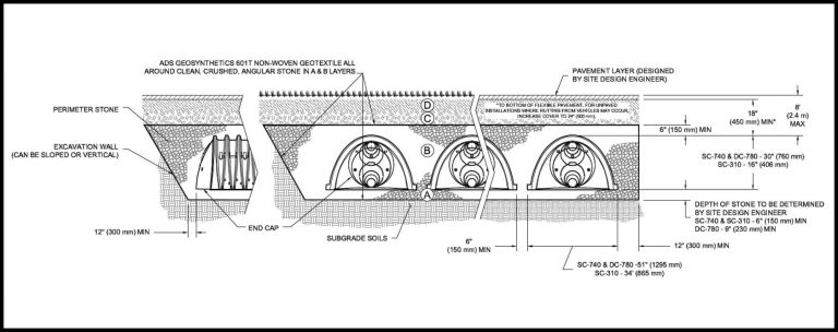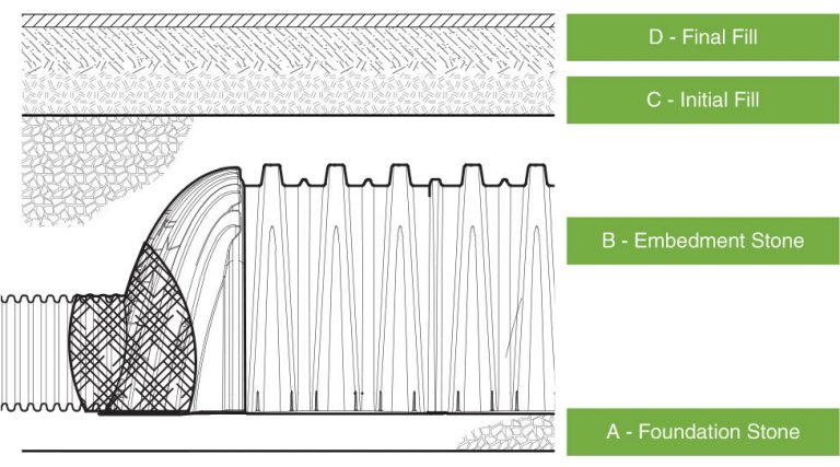 Fill Material for layer ‘C’ starts from the top of the embedment stone (‘B’ layer) to 18” (450 mm) above the top of the chamber. Note that pavement subbase may be part of the ‘C’ layer.